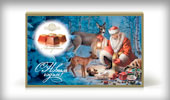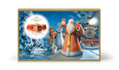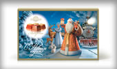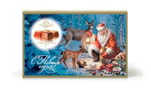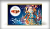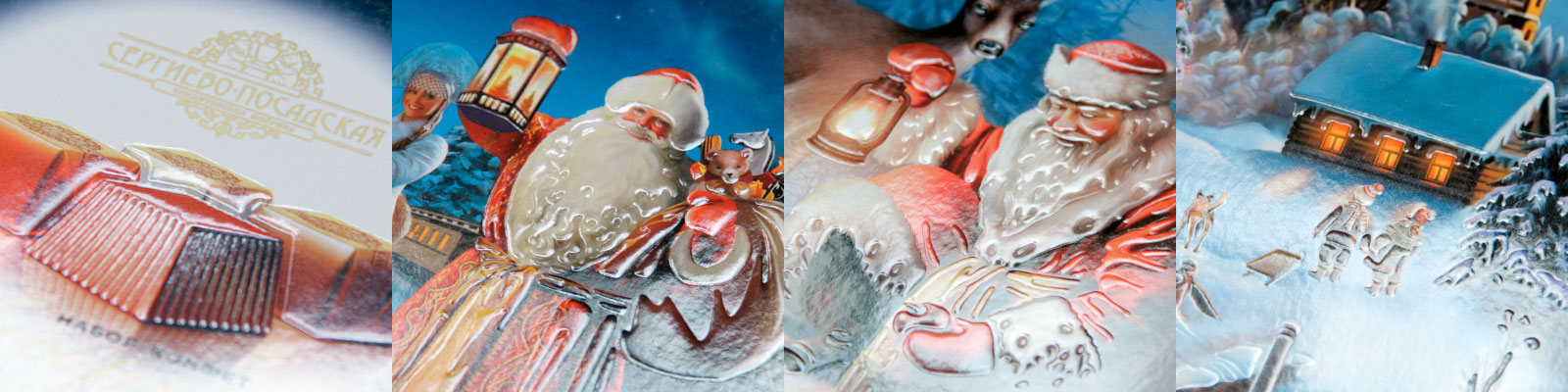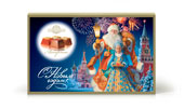 Серия коробок с традиционным новогодним дизайном для Cергиево-Посадской кондитерской фабрики. Иллюстрации выполнены совместно с Наталией Ершовой. Два сюжета — из предыдущих новогодних коробок. Всего сделано четыре больших коробки (240 г) и четыре малых (100 г).
