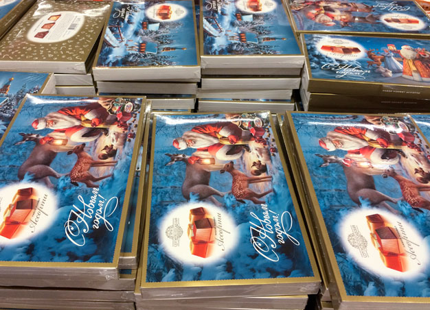 Серия коробок с традиционным новогодним дизайном для Cергиево-Посадской кондитерской фабрики. Иллюстрации выполнены совместно с Наталией Ершовой. Два сюжета — из предыдущих новогодних коробок. Всего сделано четыре больших коробки (240 г) и четыре малых (100 г).